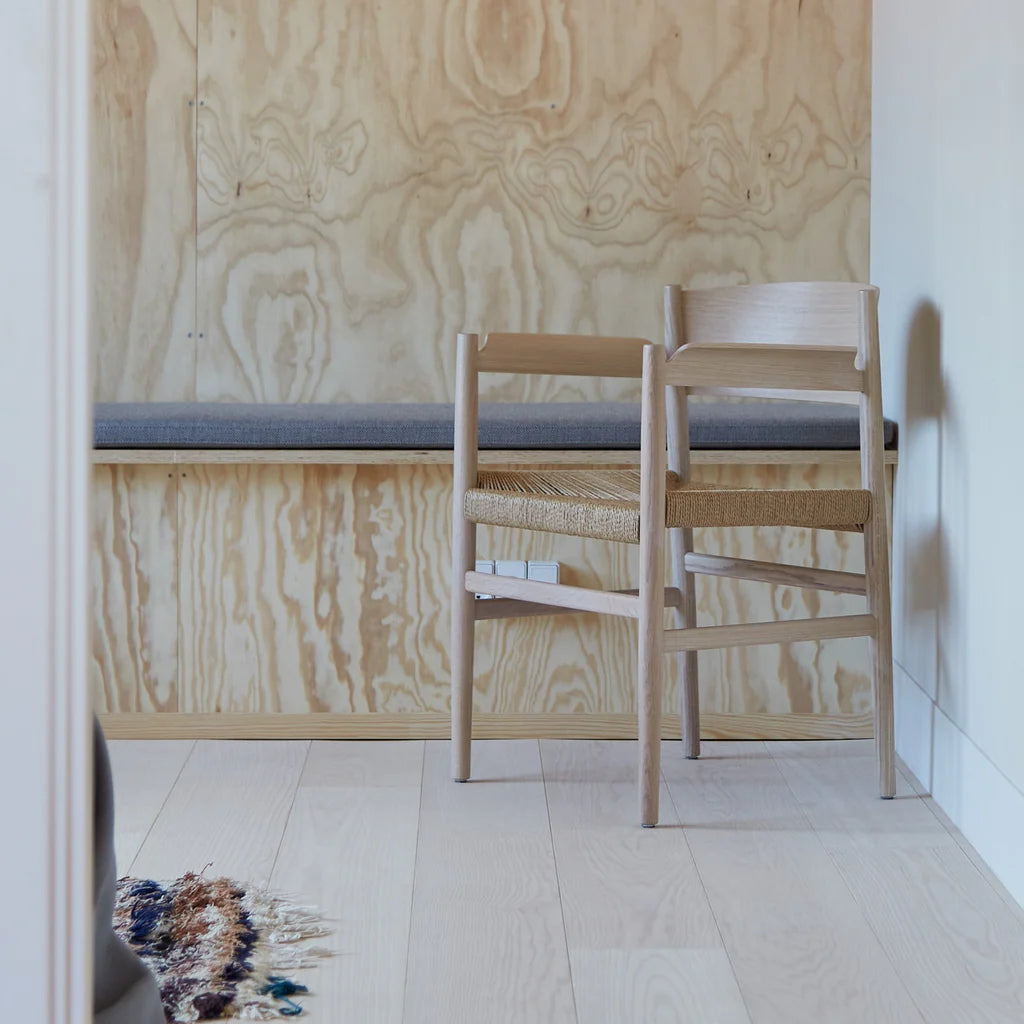 Der Armlehnstuhl Nestor von Mater ist ein elegantes und nachhaltig produziertes Möbelstück, das von Tom Stepp entworfen wurde. Inspiriert von den klassischen Shaker-Traditionen verbindet der Stuhl minimalistisches Design mit hochwertigen, natürlichen Materialien wie FSC®-zertifiziertem Eichenholz und handgewebtem Papierseil. Dieses ökologische Konzept unterstreicht Maters Fokus auf nachhaltige und umweltfreundliche Produktion.