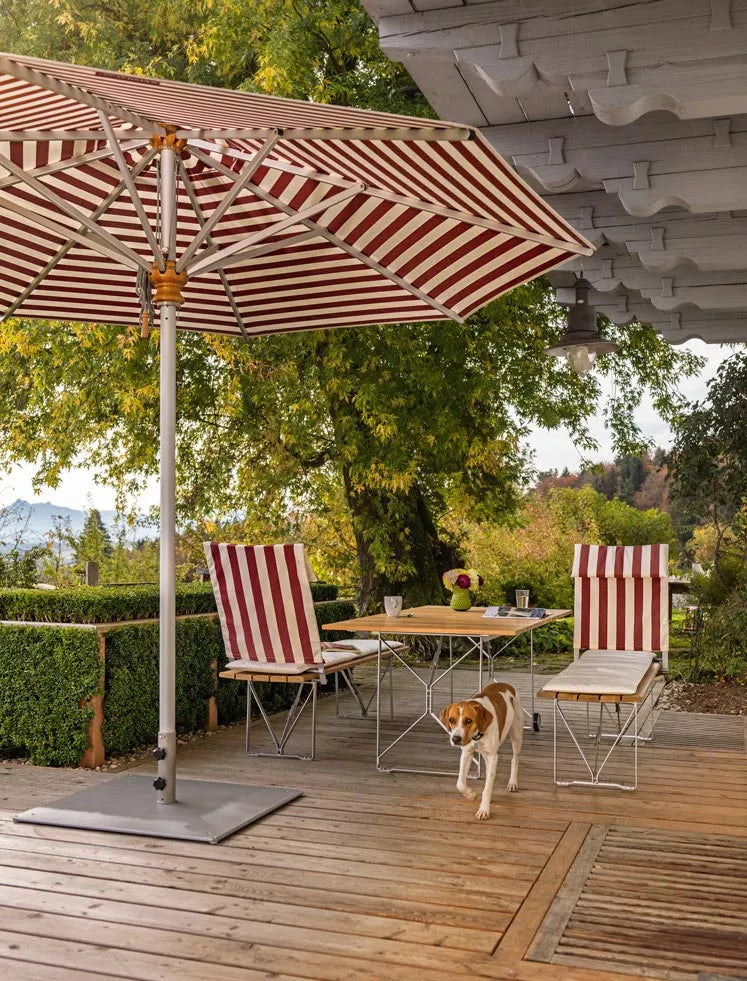 Der Aluschirm von Weishäupl vereint zeitloses Design mit hochwertiger Verarbeitung und ist die ideale Lösung für stilvollen Sonnenschutz im Außenbereich. Ob in klassisch-traditionellem oder modernem Ambiente – dieser Schirm fügt sich durch seinen durchdachten Materialmix harmonisch in jede Umgebung ein. Während Mast und Streben aus eloxiertem Aluminium für Stabilität und Leichtigkeit sorgen, setzen die Naben aus verleimtem Hartholz einen natürlichen Akzent und unterstreichen die hochwertige Ausstrahlung. Die Schirmbespannung besteht aus wetterfestem Acryltuch mit Lufthaube und bietet zuverlässigen Schutz vor Sonne, leichtem Regen und Verunreinigungen. Auch in den Größen Ø 270 cm und Ø 400 cm auf Anfrage verfügbar.